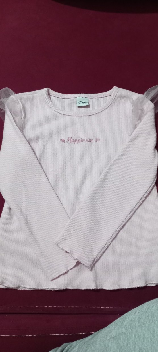Kız çocukları için uzun kollu, bol kesim ve yuvarlak yakalı, yumuşak triko kumaştan yapılmış pastel pembe tişört. Omuzlarda tül detayları ve göğüste "Hoppineso" nakışı bulunur.