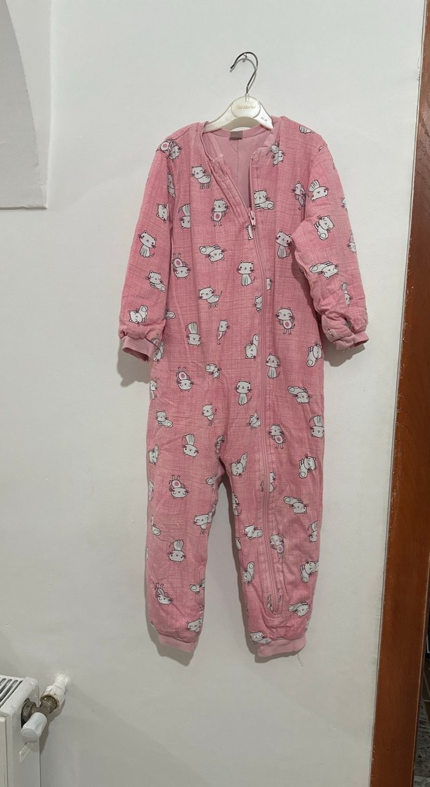Kız çocuk pembe uzun kollu tulum pijama, pastel tonlarda baskılı desenlerle. Yuvarlak yaka ve düğmeli, yumuşak ve sıcak kumaştan üretilmiştir.