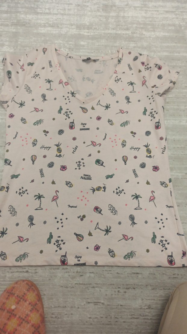 Pastel pembe renkli, bol kesim kız çocuk tişörtü. V yaka ve kısa kollu, baskılı bohem tarzda, yumuşak sentetik kumaştan.