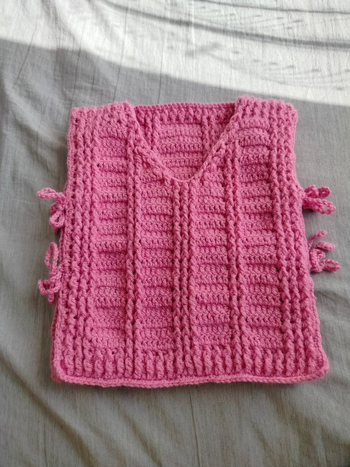 Pembe renkli kız çocuk panço, V yaka ve kolsuz tasarıma sahiptir. Yan bağcıkları ve bol kesimi ile örgü kumaştan üretilmiştir.