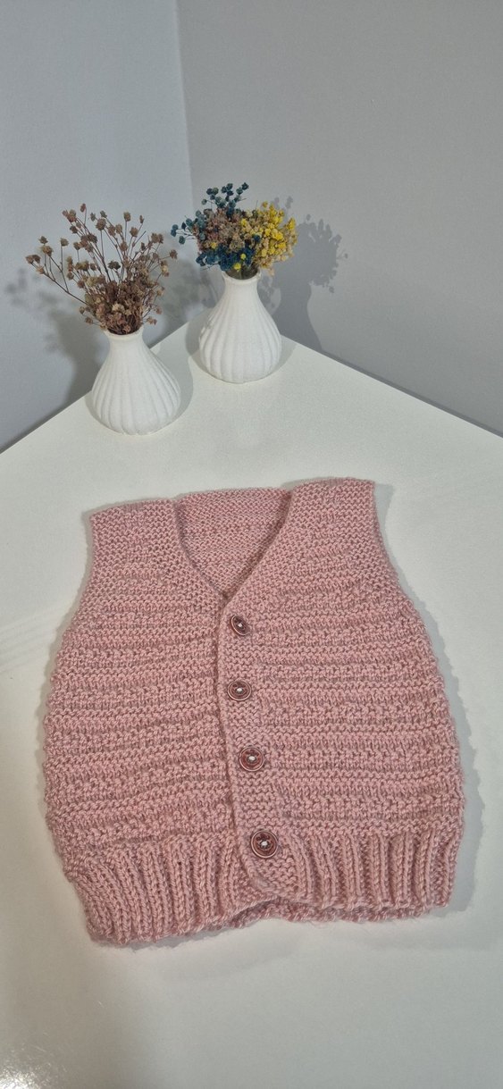 Bu pembe pastel renkli kız çocuk süveteri, V yaka ve kolsuz tasarıma sahiptir. Yumuşak örgü kumaştan üretilmiş, düğmeli ve sade görünümlüdür. kendi el emeği ürünümdür