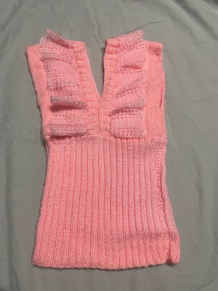 Kız çocuklar için pembe, v yaka ve süslemeli triko detaylı, kolsuz, dar kesim bir süveter. Az kullanıldı el örgüsüdür