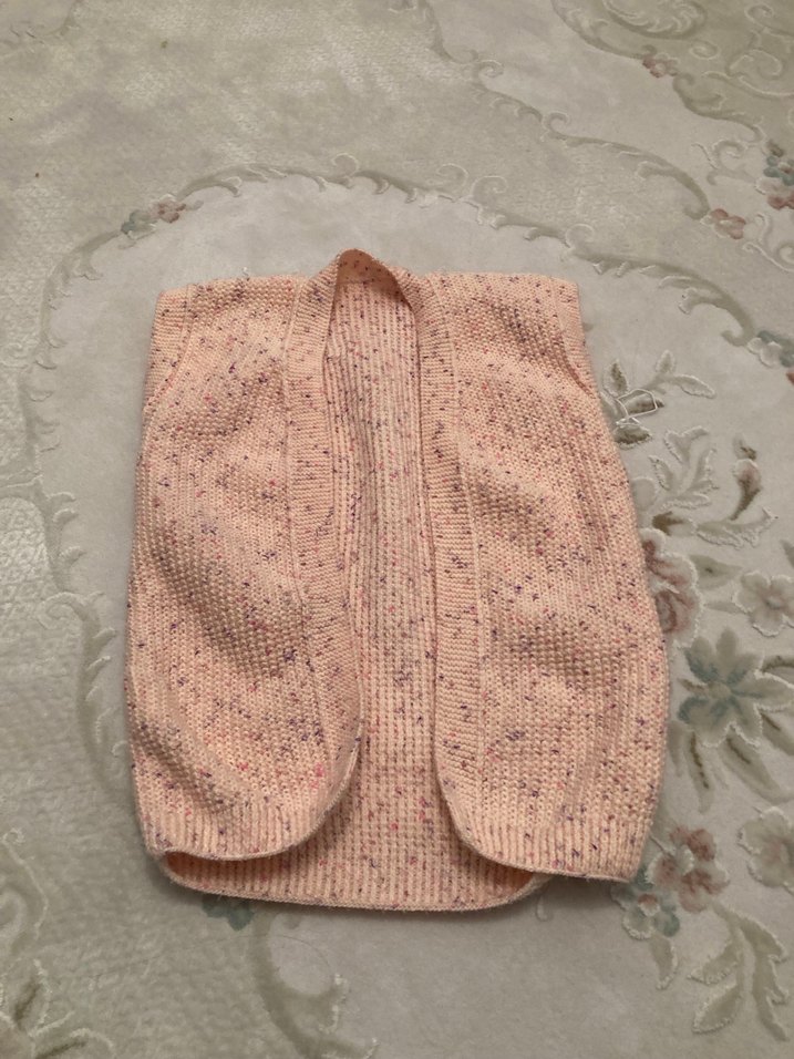 Pembe renkli, triko örme kumaştan yapılmış, V yakalı ve kolsuz kız çocuk yeleği. Bohem tarzda, trend bir görünüm sunar.
