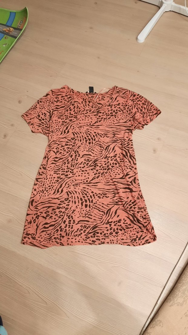 Kısa kollu, V yakalı ve bol kesim kız çocuk tişörtü. Pastel pembe tie-dye desenli ve siyah baskılı, trend sokak stili için uygun.