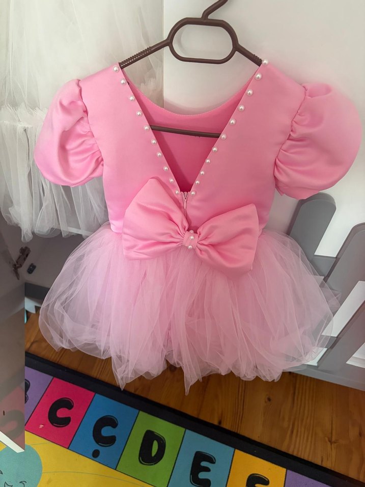 İnci detaylı V yakalı, kısa kabarık kollu, beli büyük fiyonkla süslenmiş pembe dar kesim elbise. Etek kısmı yumuşak tül görünümlü kumaştan oluşur. Uzunluğu 60 cm omuzdan Beli 28 cm Iki koltuk altı arası 31 cm