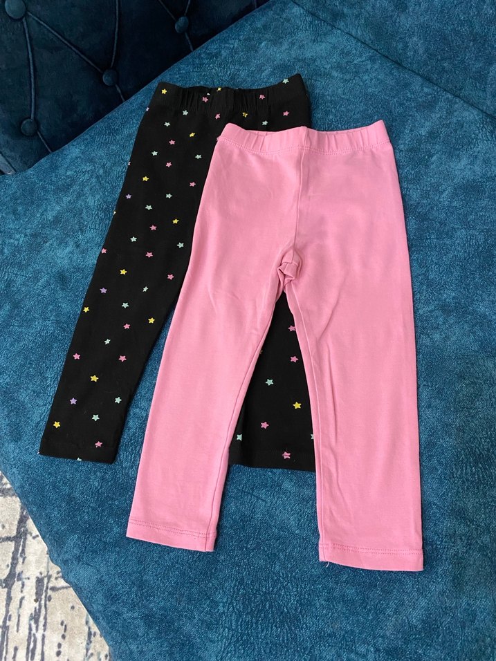 Tertemizdir. Yumuşak ve sıcak kumaştan, elastik bel bantlı kız çocuk tayt seti. Biri pembe düz, diğeri siyah renkli yıldız desenli.
