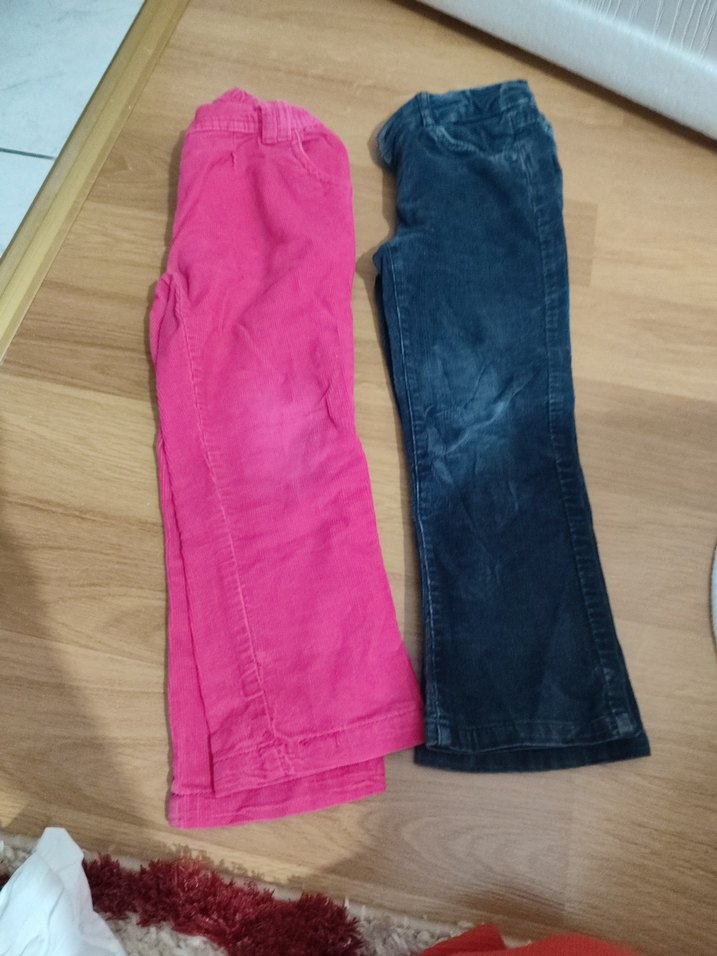 Kız çocukları için pembe ve koyu mavi renklerde, bol kesim ve elastik bel özellikli kot pantolonlar. Desensiz, rahat ve gündelik kullanıma uygun. kadife 2 li