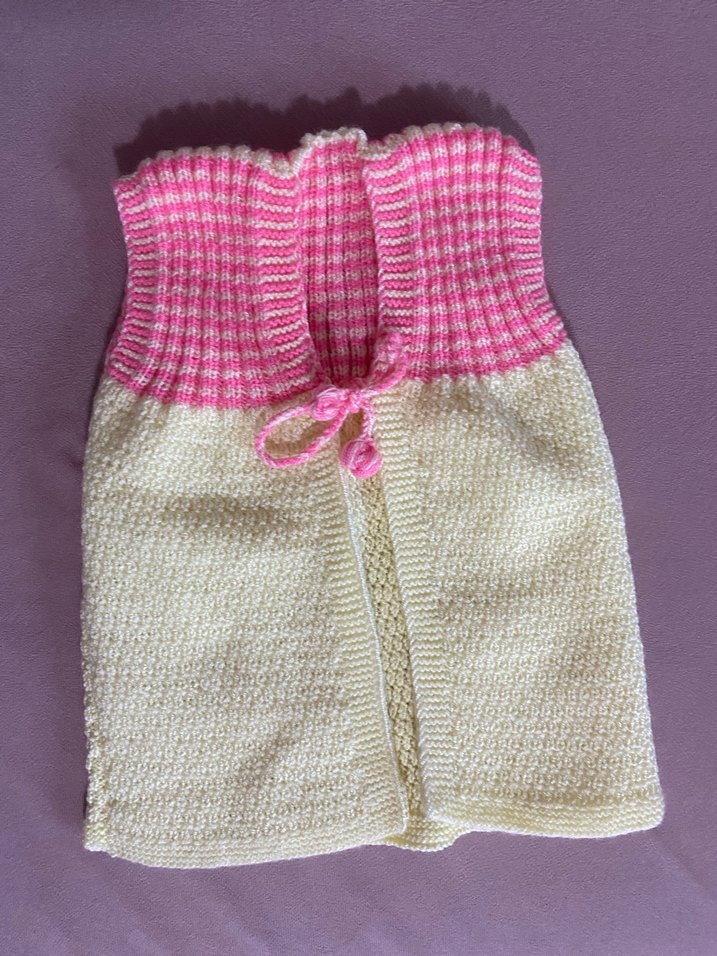 Yumuşak örgüden yapılmış, pembe fitilli üst ve krem alt kısmı olan kolsuz, bohem tarzda yelek. El emeğidir hassas ciltler için uygun ip kullanılmıştır✨