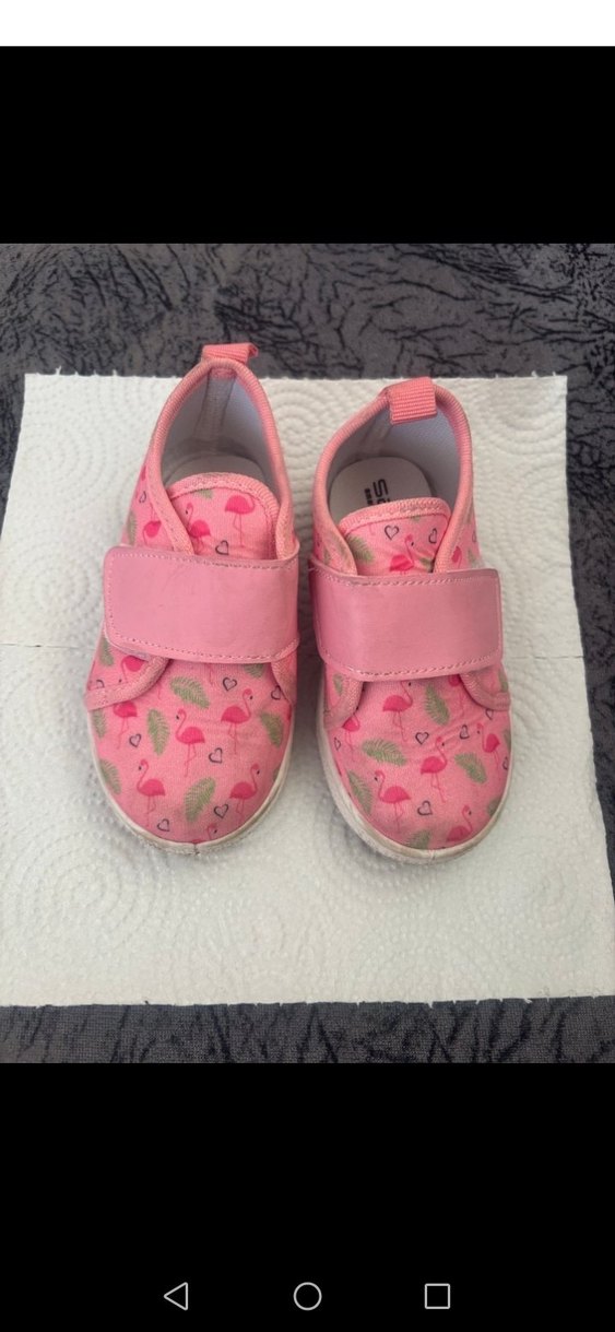 Kız çocukları için renkli bağcıksız, pembe flamingo ve kalp desenli, kolay kapanan velcro bantlı, lastik tabanlı spor ayakkabılar.
