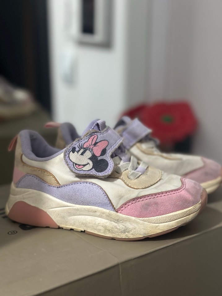 Kız çocuklar için pembe tonlarında, bağcıksız velcro bantlı, pastel tie-dye desenli spor ayakkabı. Minnie Mouse detaylı, rahat ve şık sokak stili