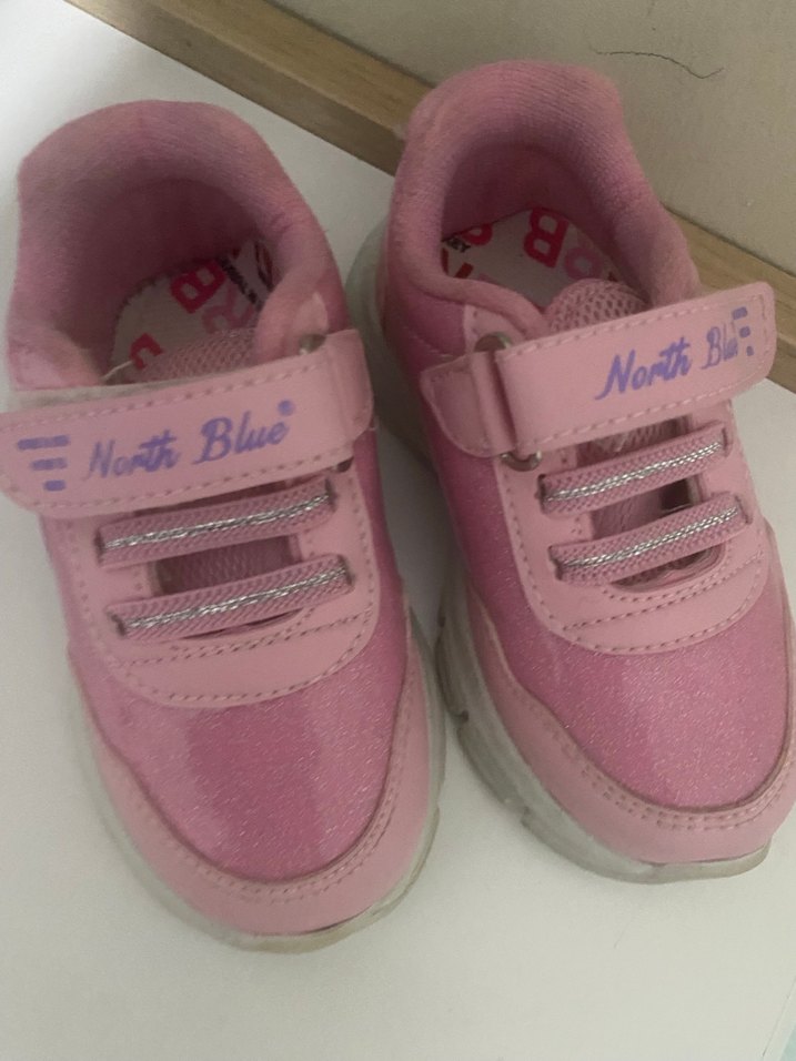 Pembe tonlarda, baskılı detaylı kız çocuk spor ayakkabısı. Kauçuk tabanlı ve kolay giyilen velcro bantlı. Üzerinde 'North Blue' yazısı bulunur. 22 NUMARa