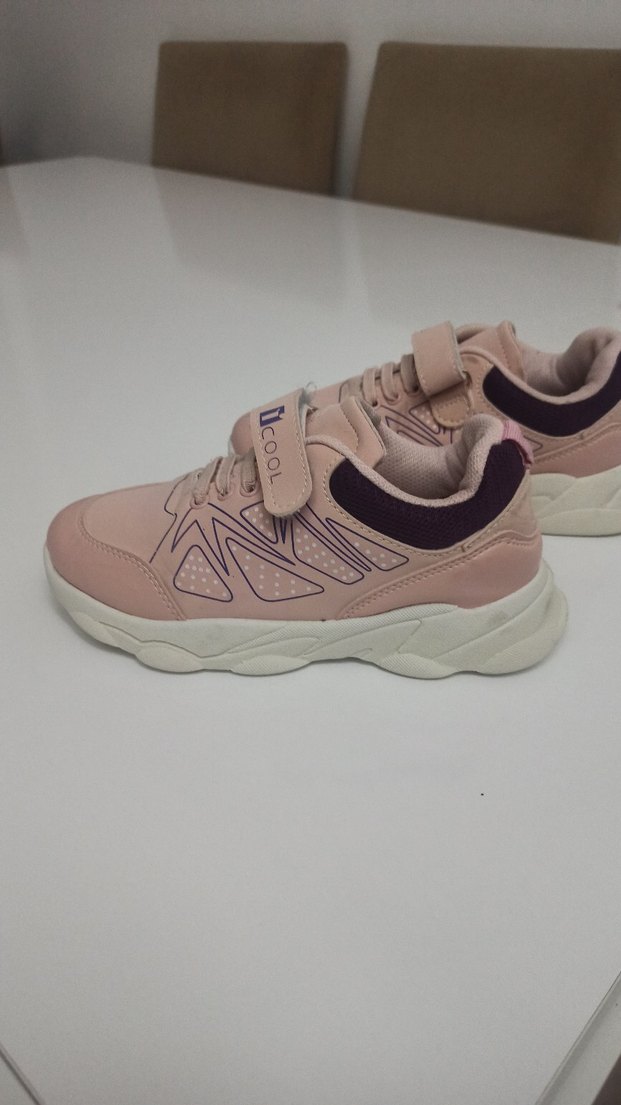 Hafif pembe renkli, baskılı desenli kız çocuk spor ayakkabısı. Kauçuk tabanlı ve kolay giyilen velcro kapamalı, günlük sokak tarzına uygun.