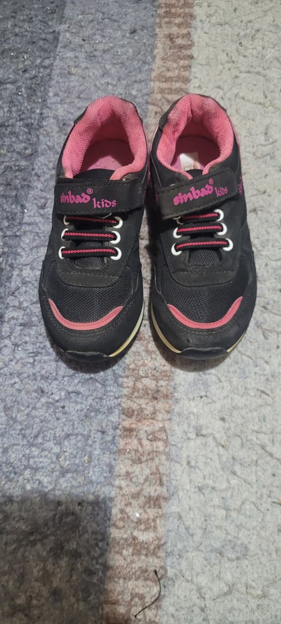 Kız çocukları için pembe detaylı, renkli baskılı spor ayakkabılar. Kauçuk tabanlı ve velcro bantlı, trend sokak stili için uygun.