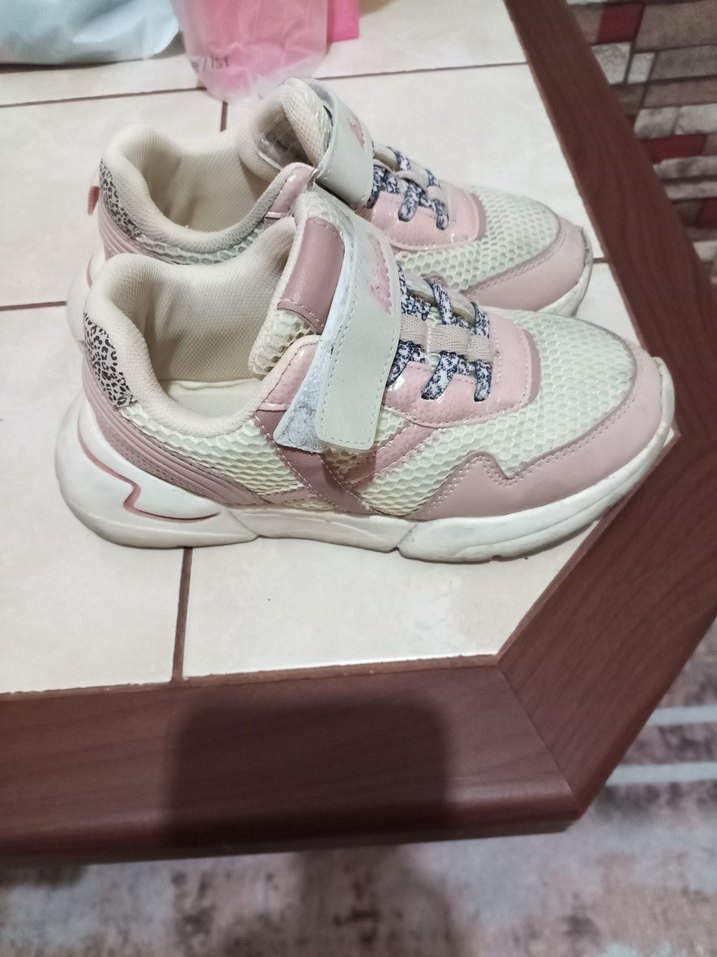 Pembe ve beyaz renklerde, yılan desenli kız çocuk spor ayakkabısı. Kolay kullanım için cırt cırtlı ve kauçuk tabanlıdır.