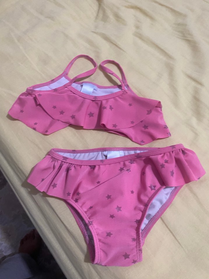 Pembe renkli, yıldız desenli kız çocuk bikini, askılı üst ve fırfırlı detaylara sahip, plaj ve günlük kullanıma uygun. 4-5 yaş uygundur.Mikili deniz patiklerinin uçları azcık yıpranmış 24/25 numaradır,kolluklar sağlam toplu fiyattır