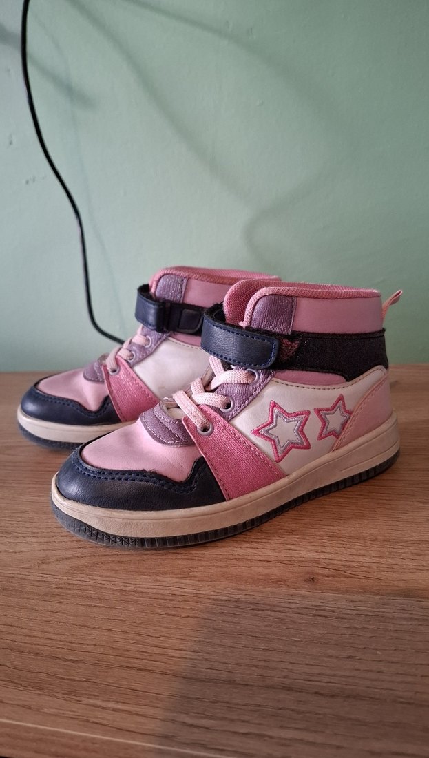 Pembe renkte, yıldız desenli kız çocuk bilekli bot spor ayakkabısı. Cırt cırtlı ve kauçuk tabanlı, sokak stiline uygun.