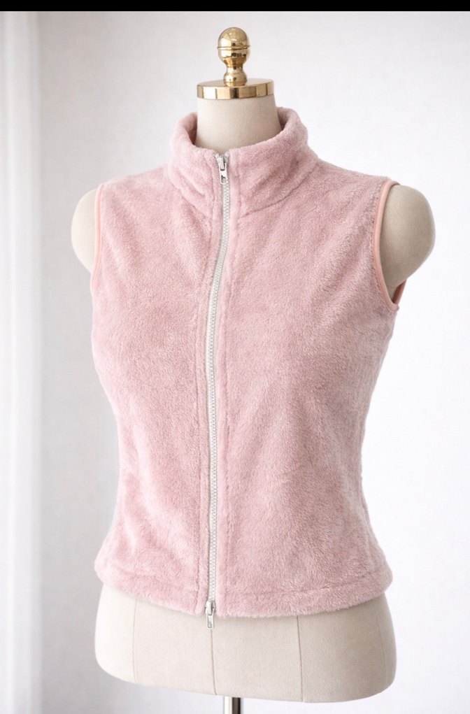 Yumuşak ve sıcak kumaştan yapılmış, pembe renkli, kolsuz ve yüksek yakalı, fermuarlı fitted yelek. Trendy casual streetwear tarzına uygundur.