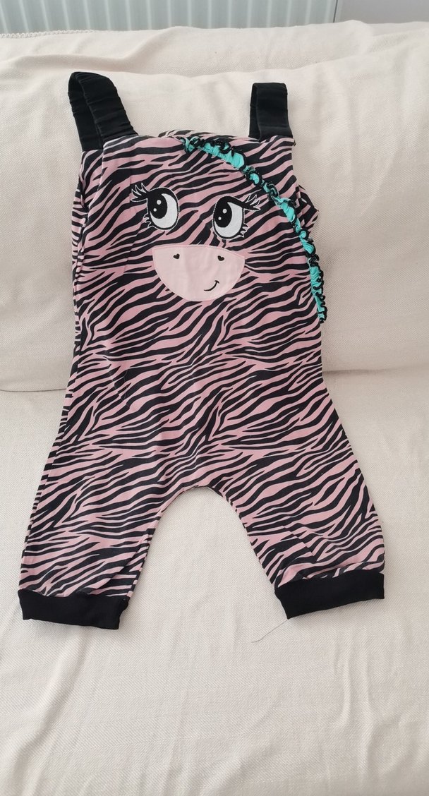 Renkli zebra desenli, pembe siyah kız çocuk tulumu. yumuşak kumaştan, askılı ve bol kesim. Sokak modasına uygun.