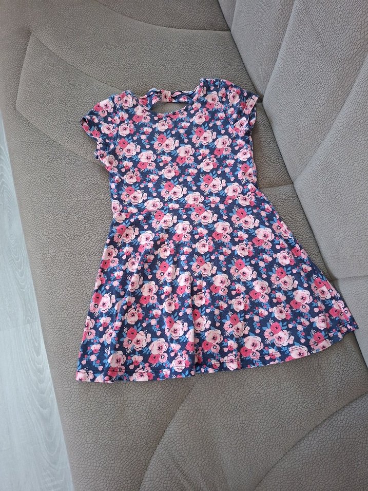 Renkli çiçek desenli, kısa kollu ve pileli kız çocuk elbisesi. Dar kesim, bisiklet yaka ve günlük şık tarzda, pembe tonlarında.