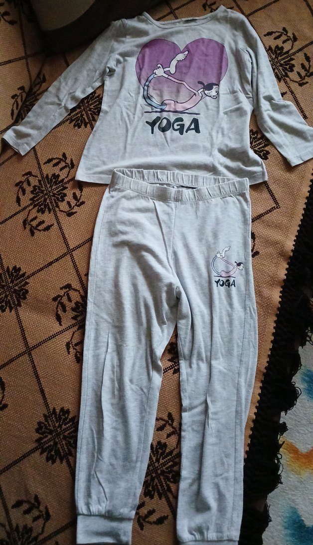 Gri renkli, uzun kollu ve yuvarlak yakalı, baskılı yoga desenli bol kesim hamile ve emzirme pijama takımı. Rahat kullanım sağlar. ♀️