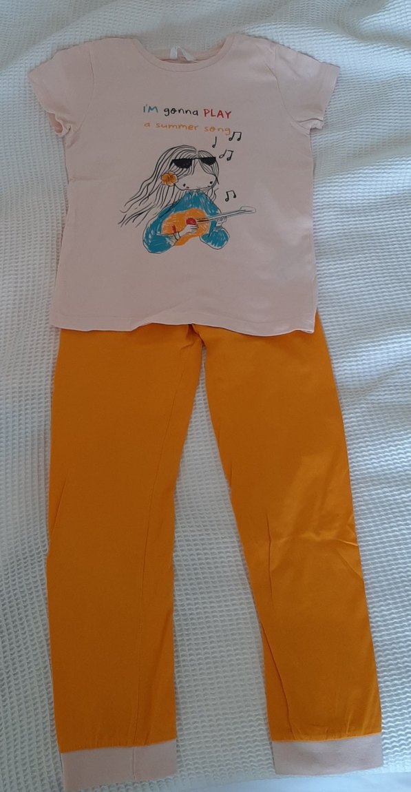 Turuncu, pamuklu ve kız çocuk pijama takımı, pastel renkli baskılı kısa kollu, bisiklet yaka üst.