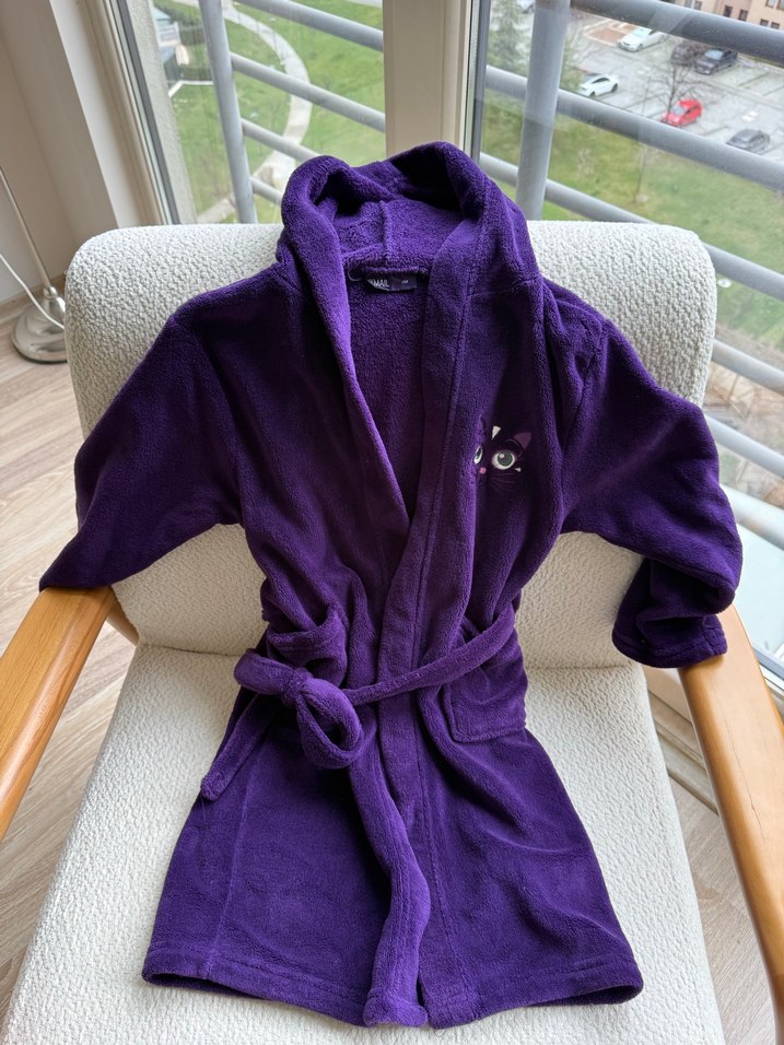 Koyu mor renkte, yumuşak dokulu kız çocukları sabahlık . Nakış detaylı, kemerli ve kapüşonludur. Kırmızı penti pijama.
