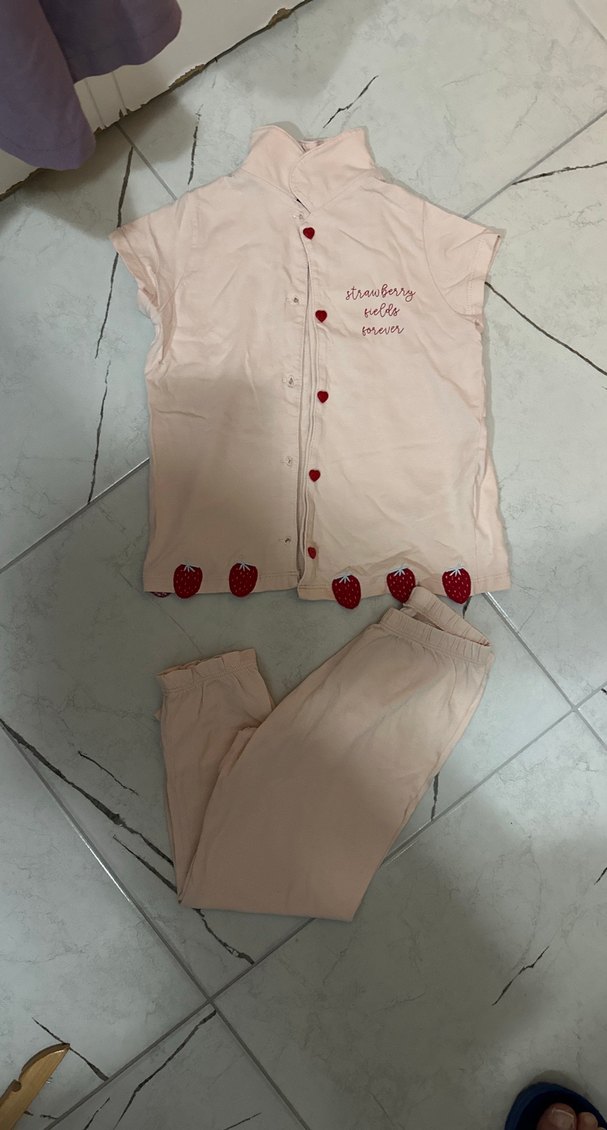 Bej renk, kısa kollu, yuvarlak yakalı, rahat kesim kız çocuk pijaması. Üzerinde nakışlı çilekler ve kalp şeklinde düğmeler bulunur. İnanılmaz yumuşak bir kumaşı var