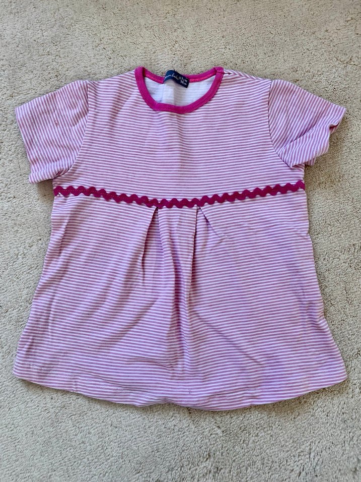 Kız çocuk tişörtü, kısa kollu ve tekne yaka modelindedir. Pile detaylı, pembe beyaz çizgili ve gevşek kesimdir. Yumuşak tekstil kumaştan üretilmiştir. 2-3 yaş
