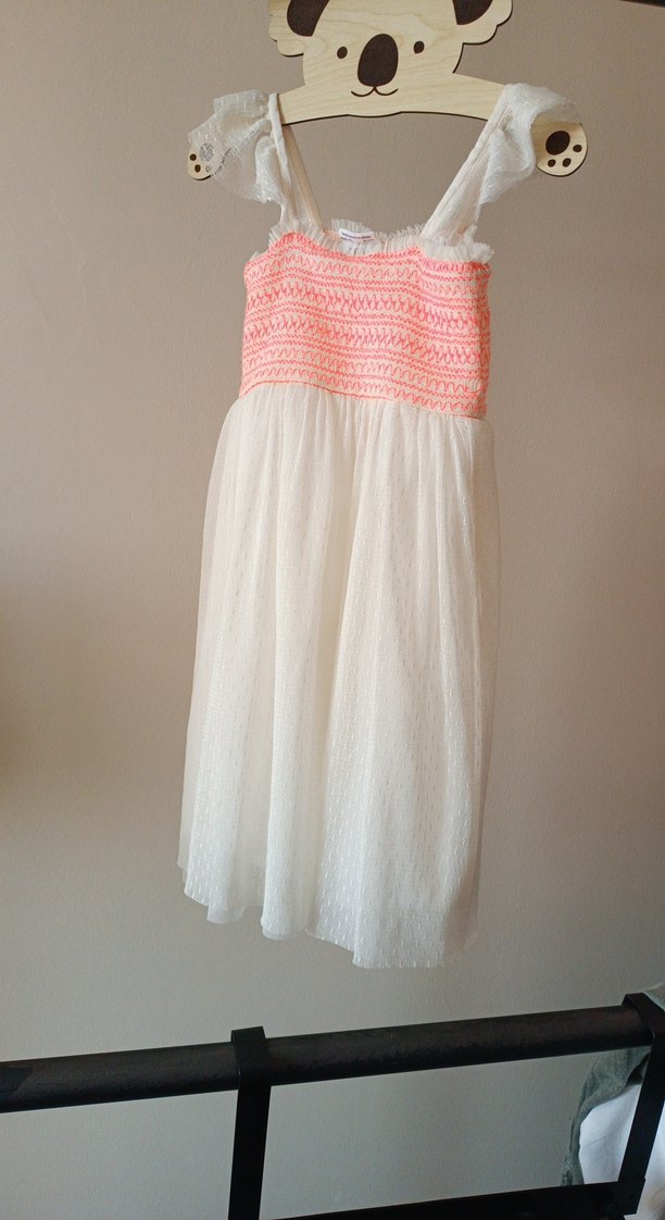 Kız çocuk için pileli beyaz kumaşlı, pastel nakışlı bohem tarzda, askılı ve straplez yakalı, bol kesim elbise. 116 cm