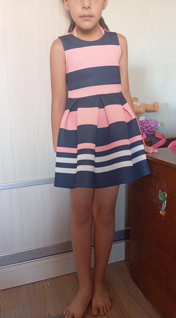 Bu kız çocuk elbisesi pastel pembe ve lacivert çizgili, pileli detaylı ve straplez yakalı, yumuşak sentetik kumaştan üretilmiştir.