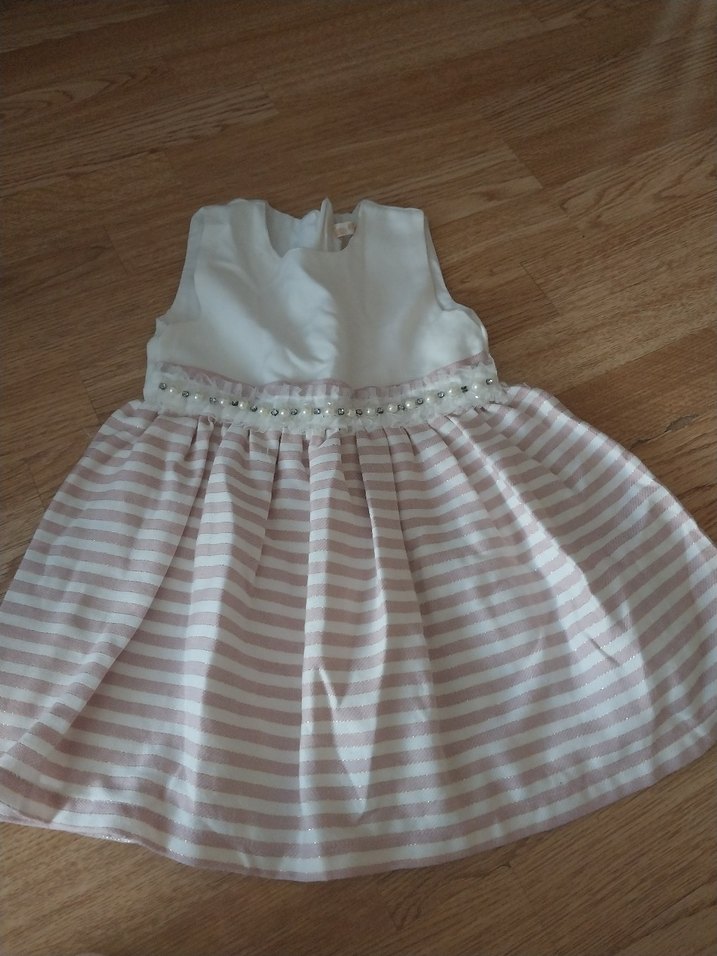 Kolsuz, straplez yaka ve pileli detaylı kız çocuk elbisesi. Pastel pembe çizgili, yumuşak sentetik kumaştan üretilmiştir. 4 yaş elbise harika inci detaylı