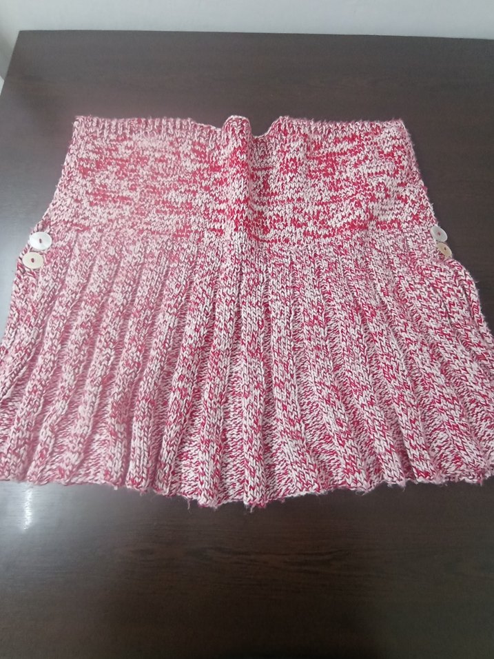 Renkli pembe örgü kız çocuk eteği, bol kesim ve pileli tasarıma sahiptir. Yanlarda düğme detayları bulunmaktadır.