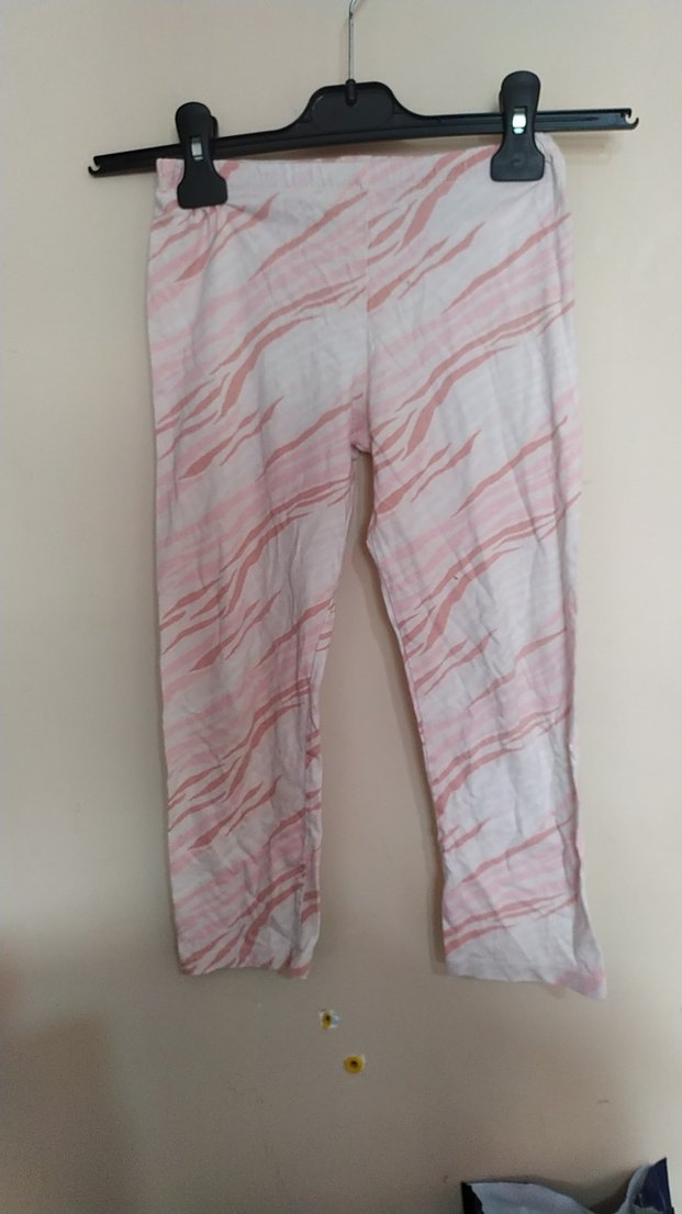 Pastel pembe batik desenli, pileli ve vücuda oturan kız çocuk taytı, yumuşak sentetik kumaştan üretilmiştir.