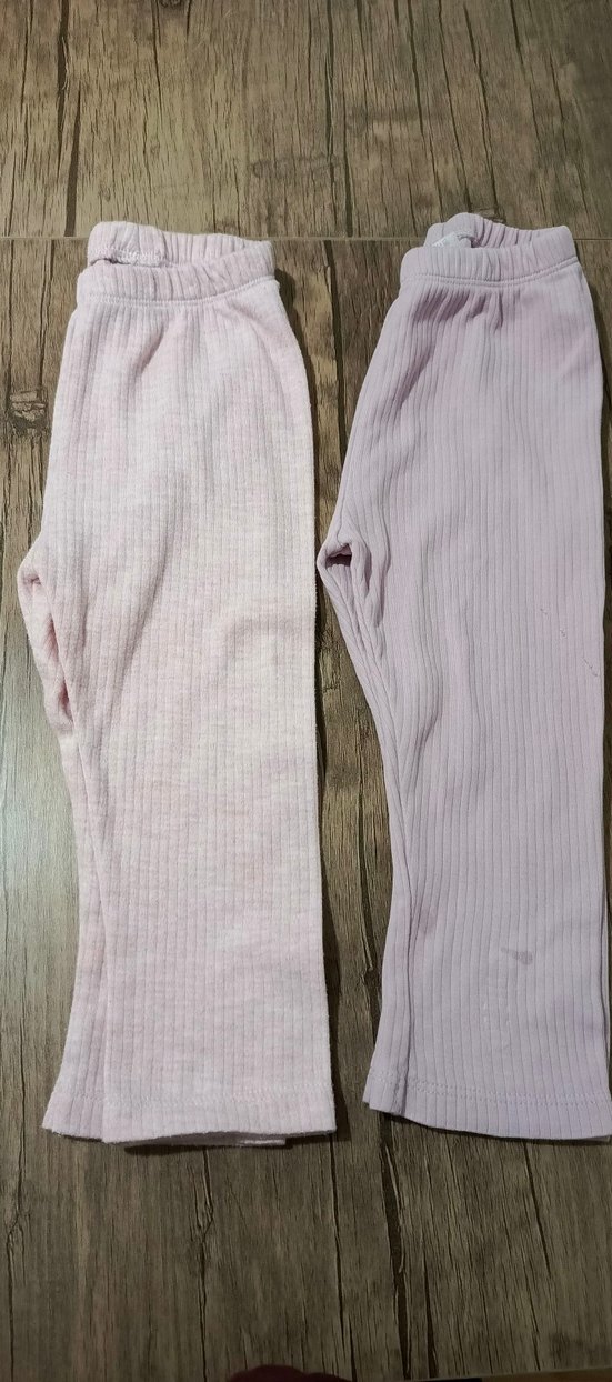 Yumuşak sentetik kumaştan yapılmış, pileli dokuya sahip, fitted kesim pembe kız çocuk taytı. Lila renkli taytın sağ bacağında leke var ama rahatsız edici değil. ikili fiyatıdır