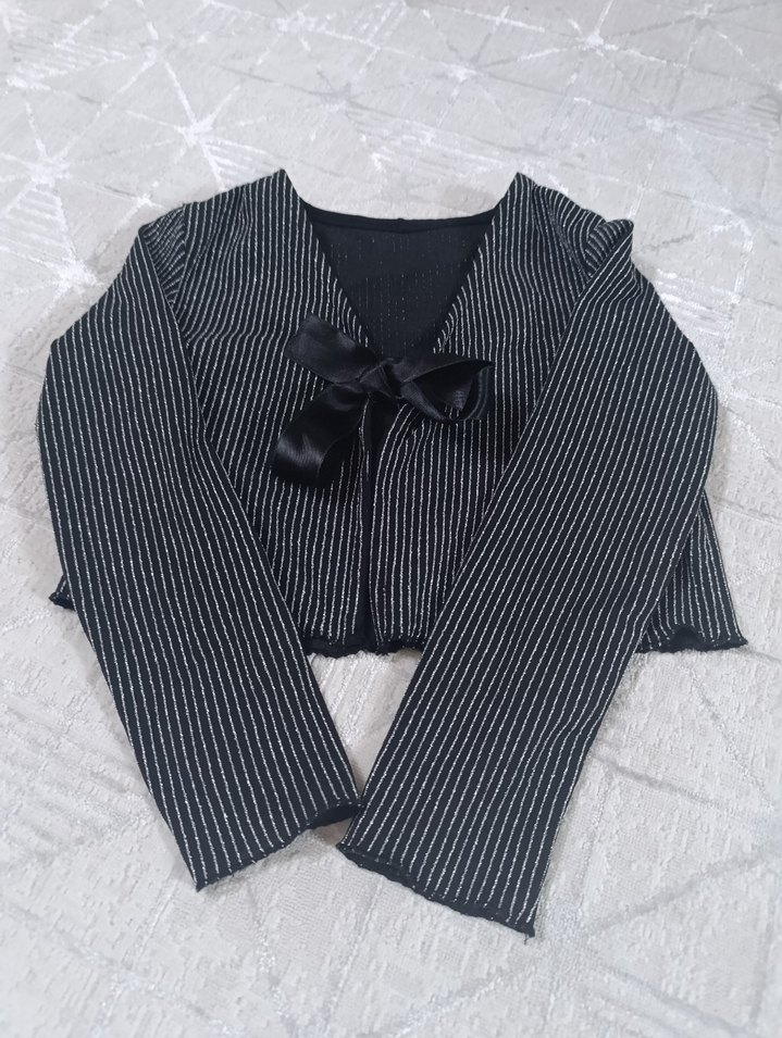 Kız çocukları için pilili, uzun kollu, tek renk siyah ve gri çizgili, ince triko kumaştan yapılmış, önünde dekoratif fiyonk bulunan bolero. alt üst takımdır 7 yaş uyumludur iki kere kullanıldı sıfır ayarında özel dikimdir