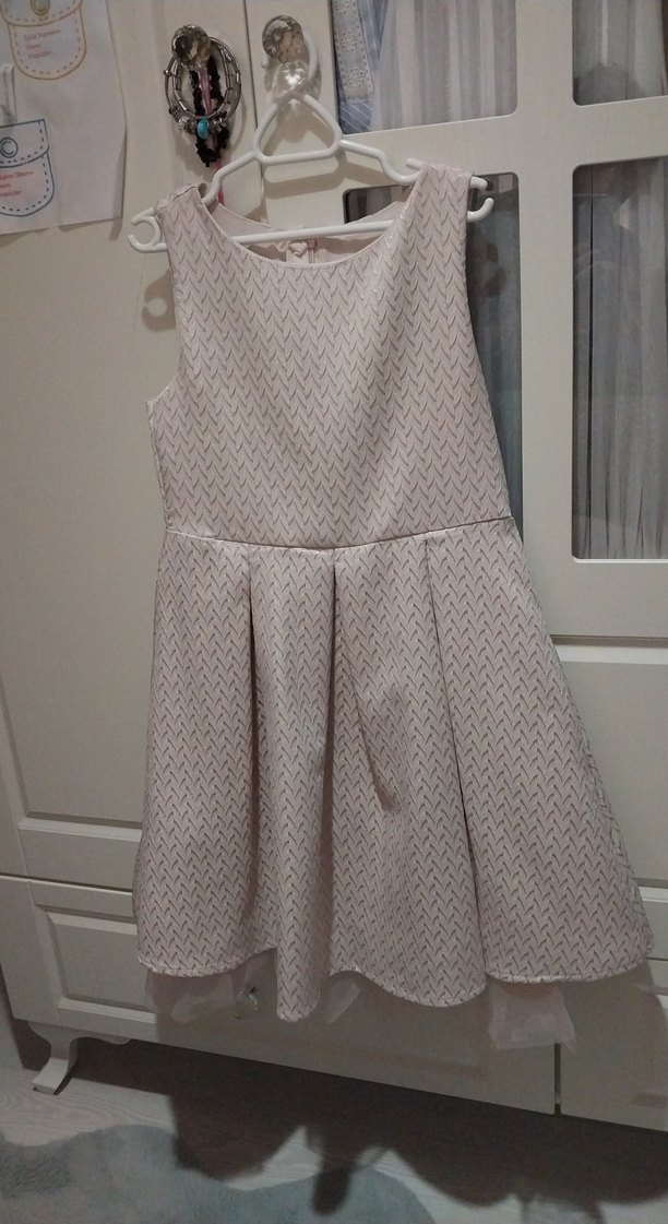 Kız çocuk için bej renkli, kolsuz, piliseli etekli ve çentikli yakalı elbise. Sentetik kumaştan, gri desenli ve regular fit.