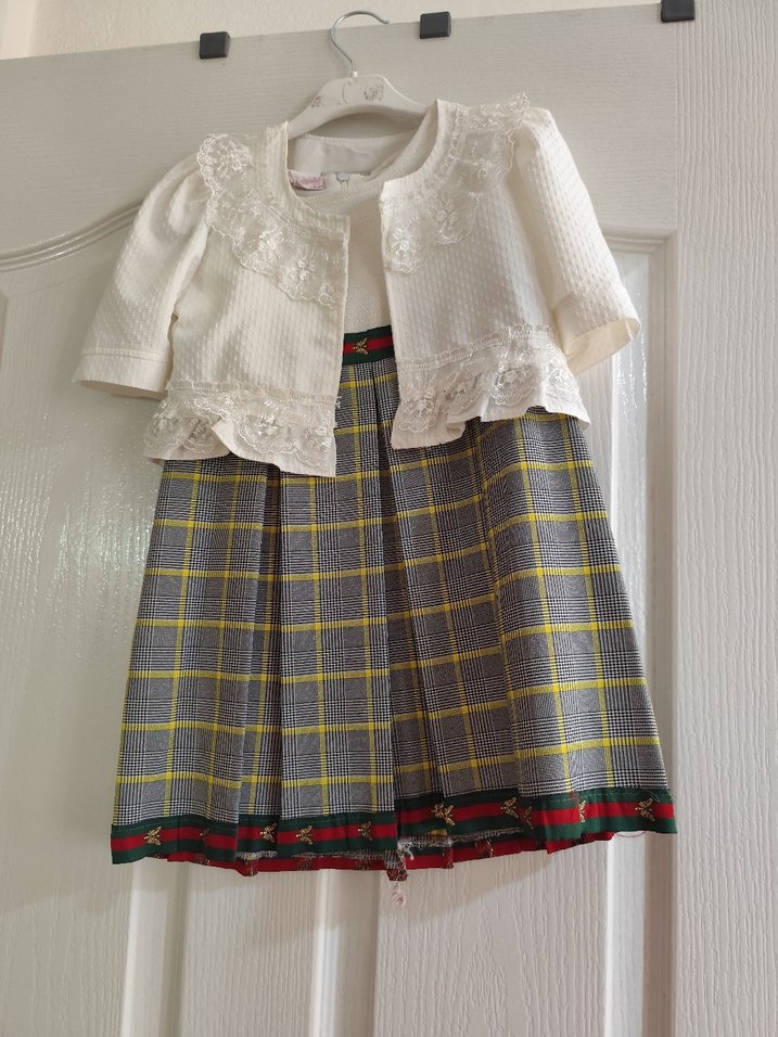Kız çocukları için piliseli, ekose desenli gri elbise ve işlemeli beyaz hırka. Elbise kolsuz ve notched lapel yakalı, rahat kesimlidir. hiç giyilmedi