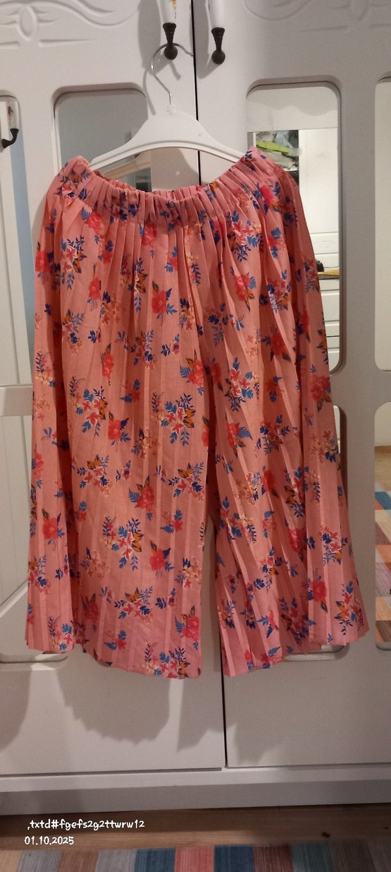 Pembe çiçekli desenli, piliseli ve bol kesim pantolon. bohem ve retro tarzlara uygundur.