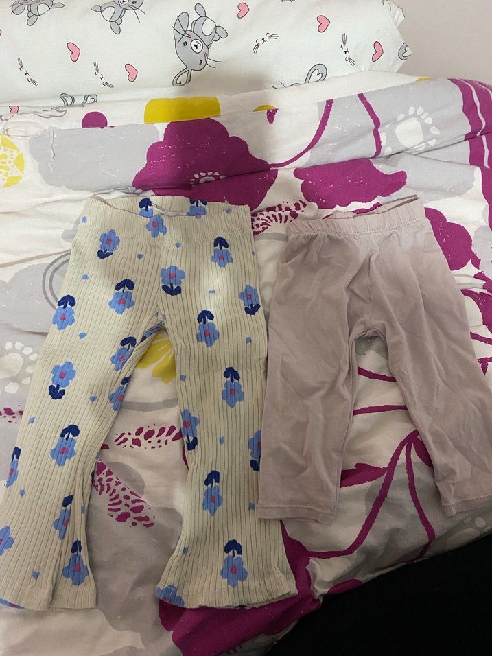 Pamuklu, piliseli ve çiçek desenli kız çocuk taytları. Biri pileli ve hafif geniş paçalı, rahat ve şık sokak tarzı için uygun. 2 yaştır sorunsuz