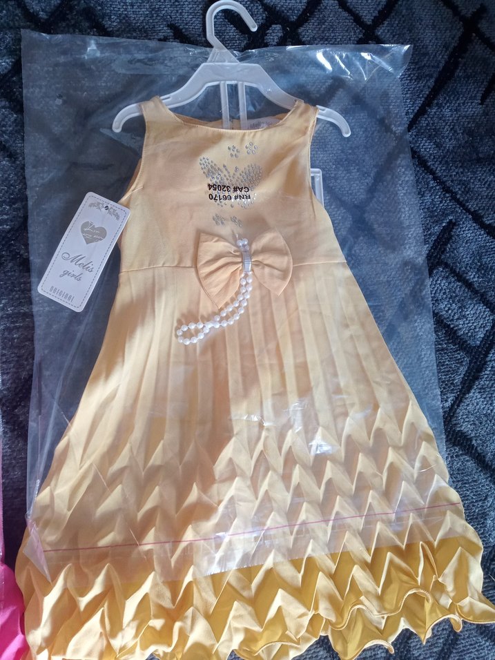 Kolsuz, piliseli etekli sarı elbise, klasik görünüm için fiyonk ve inci detaylı. Parlak sentetik kumaştan yapılmıştır. toplu alımda indirim yapılır