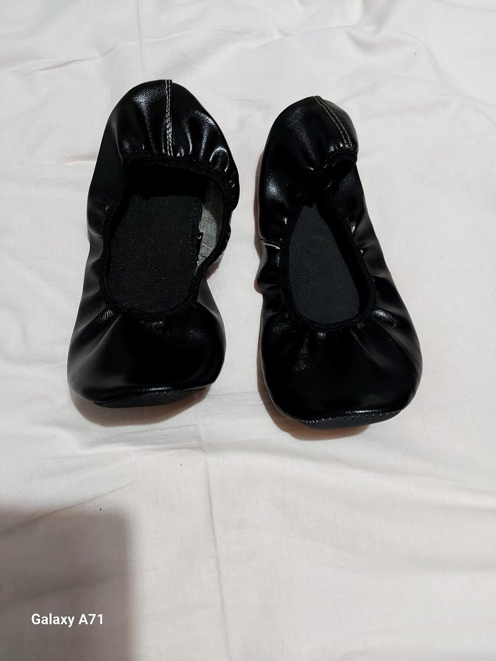 Esnek kauçuk malzemeden yapılmış, elastik bantlı siyah kız çocuk bale ayakkabısı. Desensiz ve goth tarzında, rahat bir tutuş sağlar.
