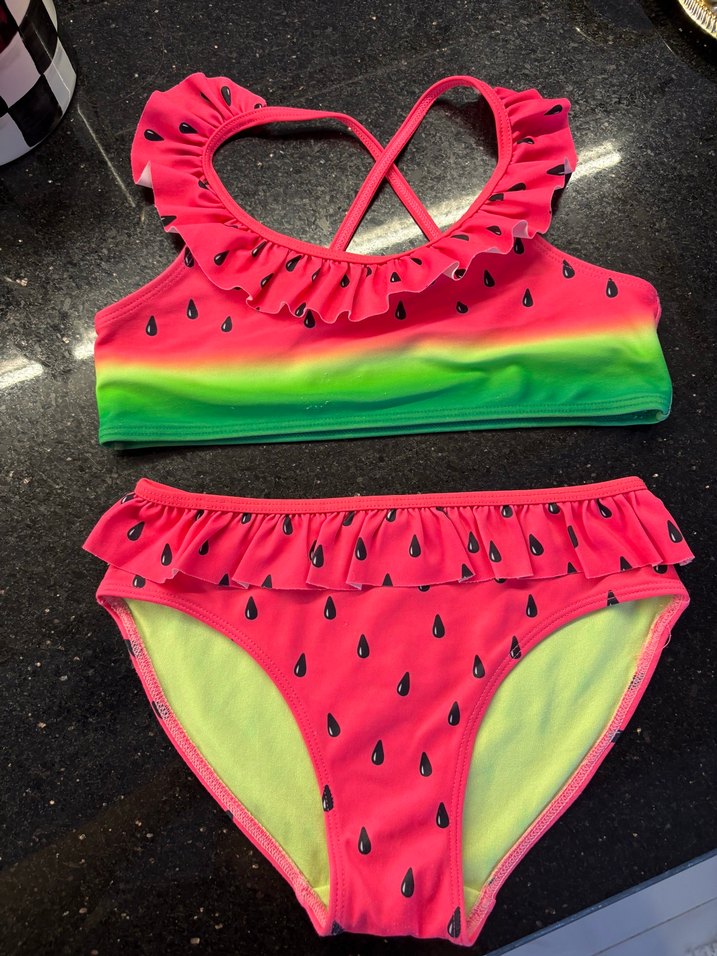 Renkli, fırfırlı detaylara sahip kız çocuk bikini. Pop art tarzında, bağcıklı askılı ve karpuz desenli, plaj için uygun.