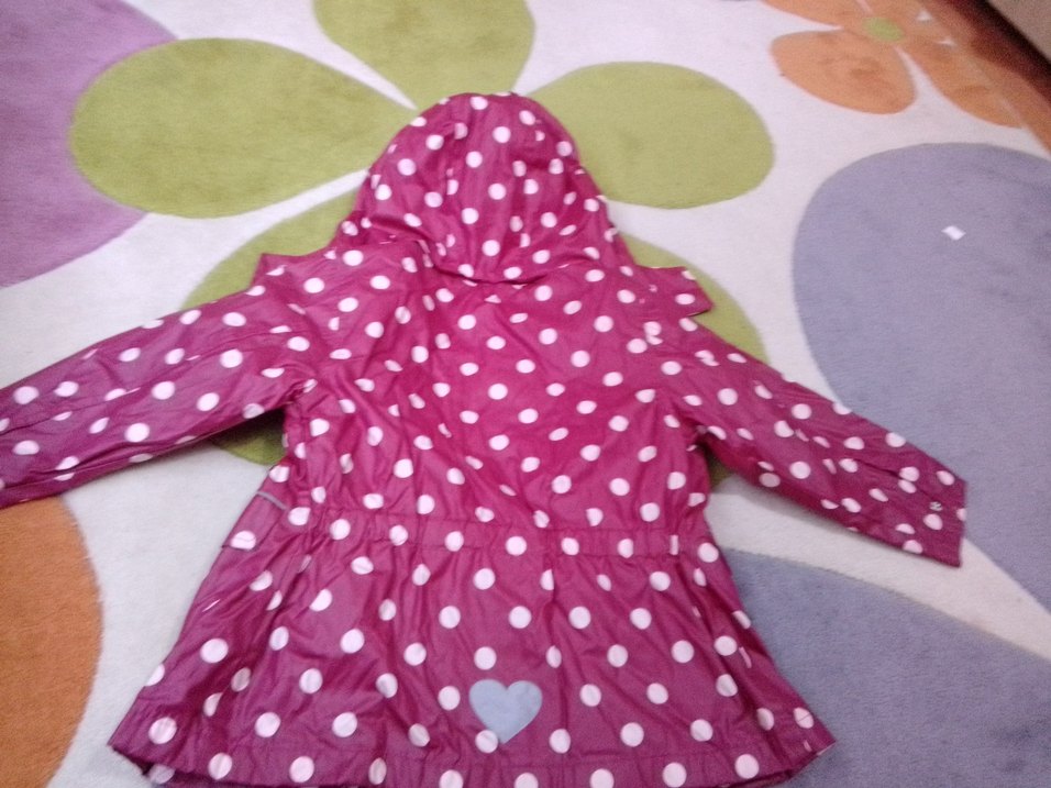 Pembe renginde, beyaz puantiyeli ve fırfır detaylı kız çocuk yağmurluğu. Sentetik kumaş, kapüşonlu ve dar kesim, sokak modasına uygun. ️