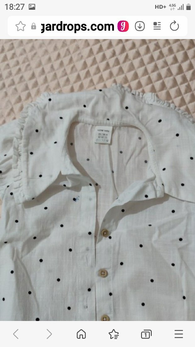 Beyaz keten kumaştan, puantiyeli, düğmeli, kısa kollu, yakalı ve bol kesim kız çocuk gömleği. Rahat sokak stili için uygun.