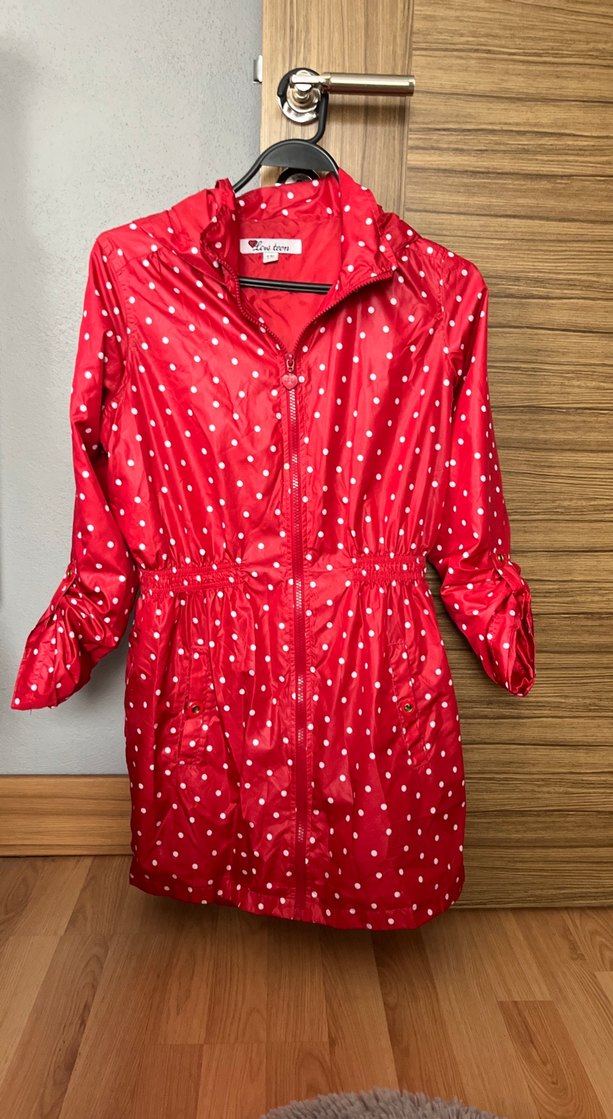 Kız çocukları için kırmızı puantiyeli, düğmeli, oturan kesim yağmurluk. Sentetik kumaştan, notched lapel yakalı, trend sokak stili için uygun. ️