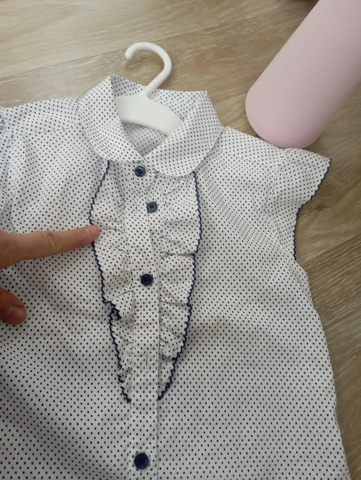 Kız çocukları için pamuklu, fitted kesim kısa kollu, yakalı gömlek. Beyaz zemin üzerinde küçük gri puantiyeler ve düğme detayları bulunur.