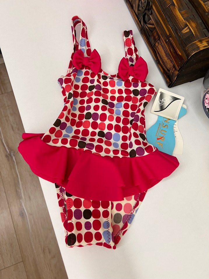 Renkli puantiyeli, askılı ve koyu pembe fırfırlı etek detaylı kız çocuk mayosu, plaj için uygundur.