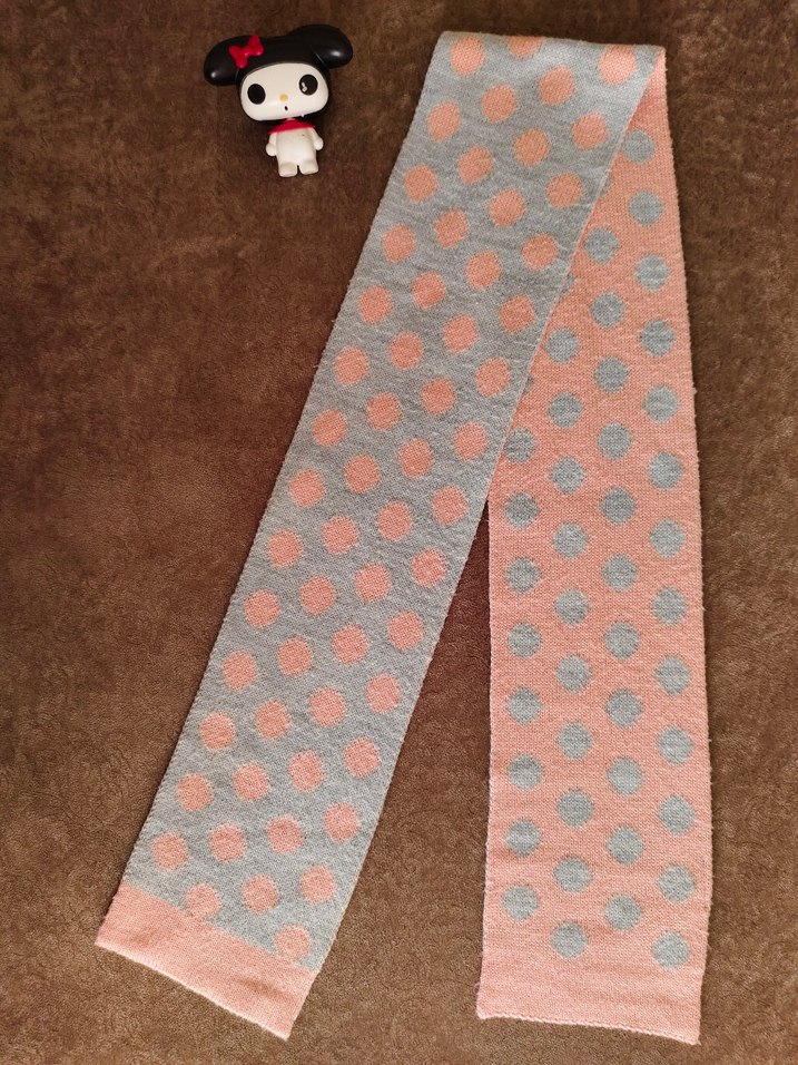 Pastel pembe zemin üzerinde yumuşak puantiyeler olan rahat örgü atkı. Defosu yoktur az kullanıldı