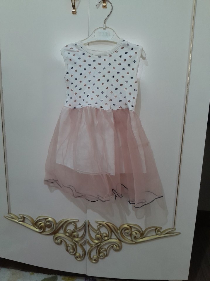 Kolsuz, puantiyeli üst kısmı ve açık pembe tül detaylı katmanlı etek kısmı olan kız çocuk elbisesi.