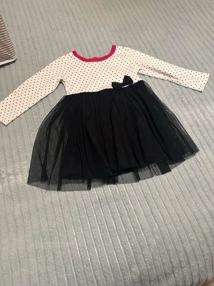 Kız çocukları için uzun kollu, fitted kesim elbise. Beyaz puantiyeli üst kısmı ve pembe yakası, siyah fırfırlı etek kısmı yumuşak sentetik kumaştan yapılmıştır.